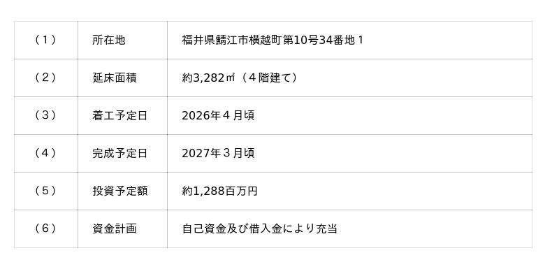 当社は、福井県鯖江市の本店における人員キャパシティが超過する見込みであり、持続的な価値創造と更なる挑戦に向け、既存事業の成長の加速、新規事業への取組強化、それに伴う採用強化に対応すべく、2027年3月頃を目途に本店を増築することを決定いたしました。