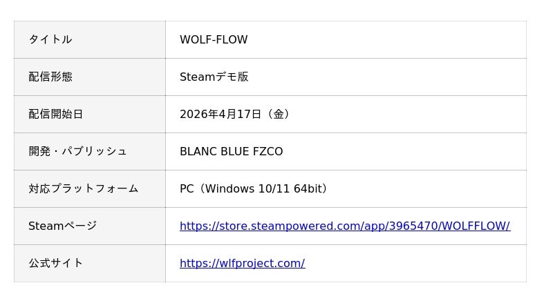 abc株式会社(本社:東京都港区、代表取締役:松田 元、証券コード:8783、以下「当社」)は、当社の戦略的パートナープロジェクトである「WLF PROJECT」が開発を進めるPC向けオンライン対戦ゲーム『WOLF-FLOW』のデモ版が、2026年4月17日(金)よりSteamにて公開されることをお知らせいたします。