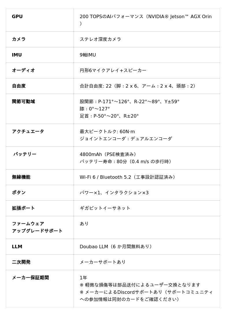 頭部(2自由度): ヨー(Yaw)軸およびピッチ(Pitch)軸の関節を備えています。また、深度カメラとマイクアレイを内蔵しています。