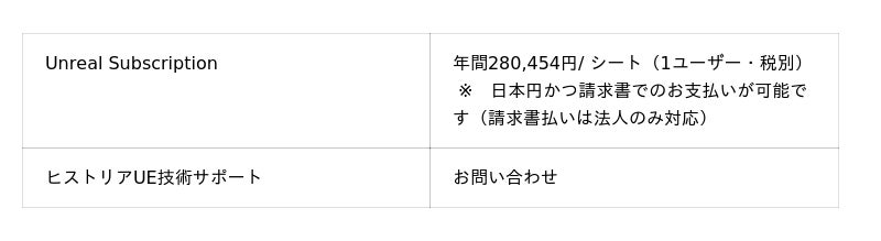 ※Unreal Subscriptionとは別に、ヒストリアUE技術サポートのみのご利用も可能です。
