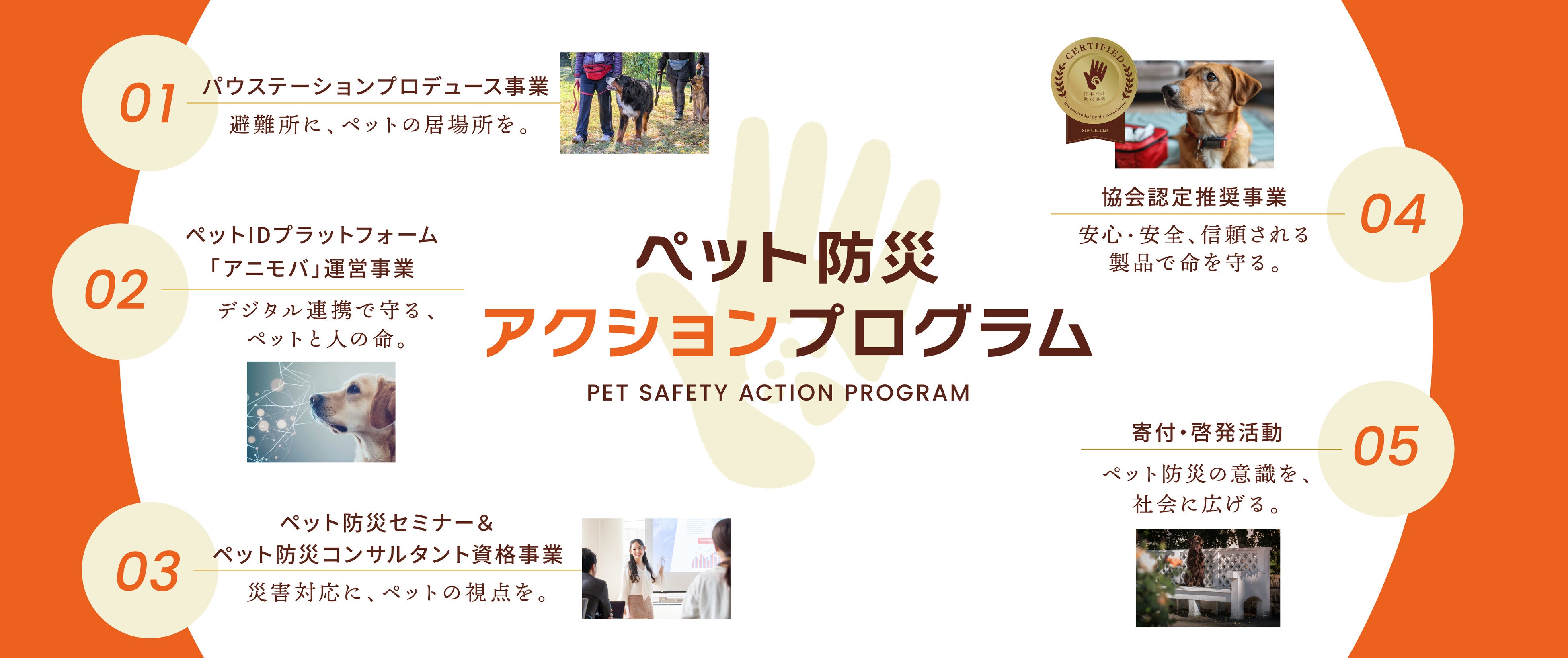 本プログラムでは、ペット同行・同伴・同室避難の普及、ペット二次避難拠点「パウステーション」の整備、ペット防災IDプラットフォーム「アニモバ」の活用、自治体および企業との連携などを通じ、社会全体でペット防災を支える仕組みづくりを推進していきます。