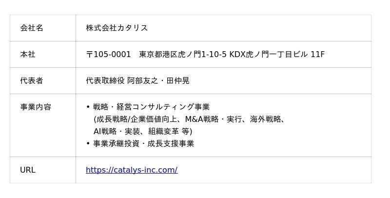 - 共同提案・クロスセルによる顧客価値の最大化両社はそれぞれの顧客基盤を活かし、グローバル展開を志す日本企業に対して、戦略コンサルティングとHonyakuOSを組み合わせたソリューションを共同で提案してまいります。- カタリスによるクイーン社への経営支援カタリスは、クイーン社に対して事業成長戦略、価格戦略、組織設計、ソリューション開発をはじめとする経営コンサルティングを提供し、クイーン社の事業拡大を支援します。- クイーン社によるHonyakuOSのカタリスへの提供クイーン社は、カタリスおよびカタリスのクライアントに対して、HonyakuOSを活用した多言語コンテンツ管理・ローカライゼーション支援を提供し、海外展開におけるマーケティング品質の向上と業務効率化を実現します。