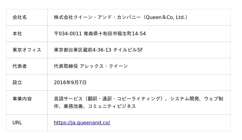 クイーン社は、言語とテクノロジーの融合により「翻訳のその先」を実現する、企業向け多言語コンテンツ管理プラットフォーム企業です。2016年の創業以来、翻訳・通訳・コピーライティングを基盤としつつ、言語サービスの在り方そのものを再定義し続けてきました。国内(東京・⻘森)および英国ロンドンに拠点を構え、グローバルな事業体制を有しています。