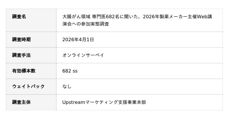 株式会社スマートホスピタル(Upstreamマーケティング支援事業本部)は、大腸がん領域の専門医を対象に「製薬メーカー主催Web講演会の参加状況および参加契機」に関するアンケート調査を実施しました。682名の有効回答をもとに、2026年時点におけるWeb講演会の参加動向と、参加に至るきっかけの傾向をまとめています。