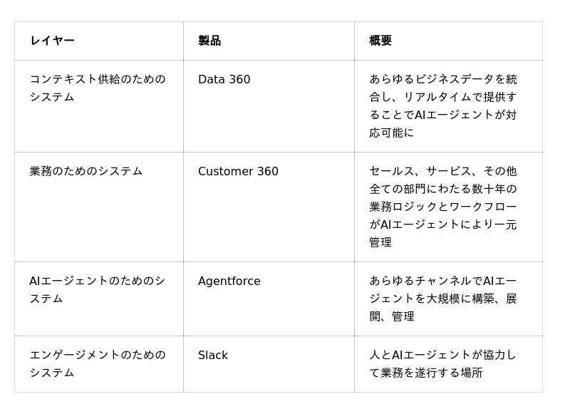 多くのベンダーが1つのレイヤーを提供することはできます。2つ提供できるベンダーもあります。しかし、これら4つすべてを統合された形で提供し、すでに企業の環境の中で稼働しているのは、Salesforceだけです。