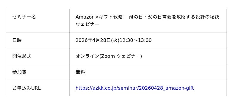 株式会社AZ(本社:大阪市中央区本町、代表取締役社長:藤堂 高義)は、2026年4月28日(火)12:30から【Amazon×ギフト戦略: 母の日・父の日需要を攻略する設計の秘訣ウェビナー】をオンラインで開催いたします。