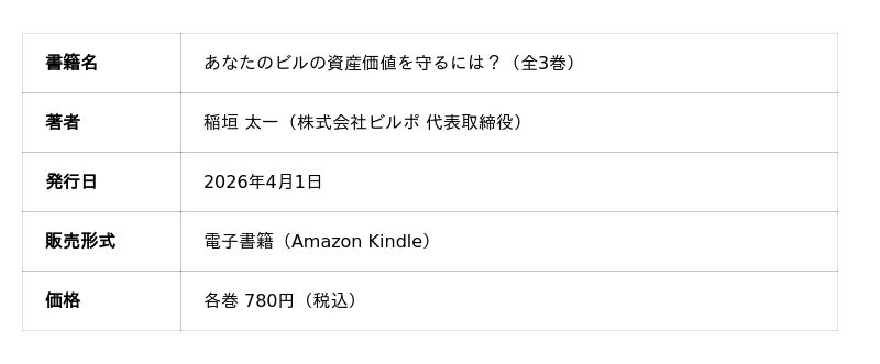 株式会社ビルポ(本社:東京都中央区、代表取締役:稲垣太一)は、2026年4月16日に、電子書籍シリーズ「あなたのビルの資産価値を守るには?」全3冊をAmazon Kindleにて同時発行いたします。ビルオーナー・ビルメンテナンス企業・設計士/ゼネコンという業界の各レイヤーに特化した実践的な内容でスマートビル化の全論点を論じた三部作です。各巻定価780円(税込)。