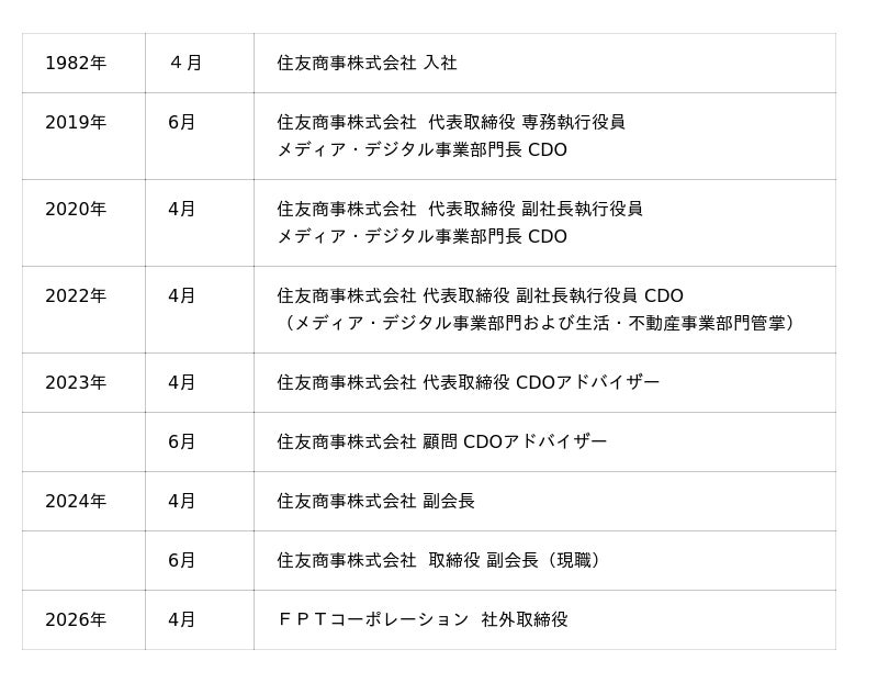 FPTコーポレーション(本社:ベトナム・ハノイ 以下 FPT)は、住友商事 取締役副会長の南部 智一氏が2026年4月16日(木)付で、社外取締役に就任した事をお知らせいたします。