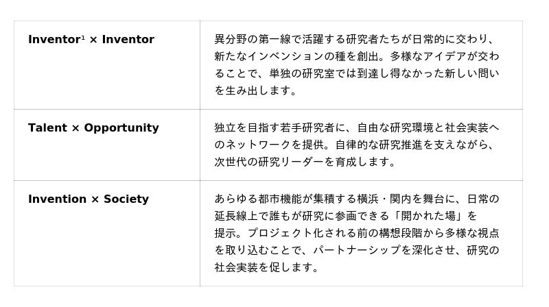 スポーツ施設や教育施設、企業など、多様な機能が集積するこの地において、研究者はラボの内側にとどまらず、社会と接続された環境で活動します。そこでの出会いをきっかけに、異分野との新たなパートナーシップを生み出し、社会を動かすインベンションの創出へとつなげていくことを目指します。