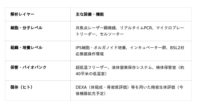 最大の特徴は、分子・細胞レベルから個体(ヒト)レベルまでを一拠点で完結させる垂直統合型の解析基盤です。一般的に分断されがちな異なった階層のデータを、シームレスに取得可能な研究基盤を提供します。