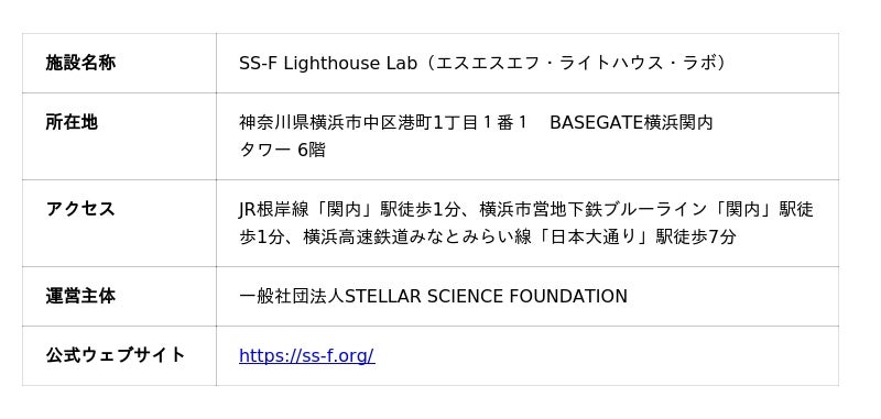 一般社団法人STELLAR SCIENCE FOUNDATION(ステラ・サイエンス・ファウンデーション、所在地:神奈川県横浜市、代表理事:武部貴則、以下「SS-F」)は、本日、「BASEGATE横浜関内」タワー6階に、新たな研究拠点「SS-F Lighthouse Lab(エスエスエフ・ライトハウス・ラボ、以下「本拠点」)」を開設いたします。