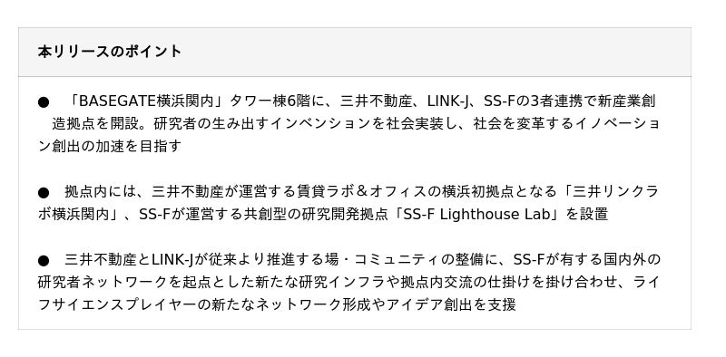 三井不動産株式会社(本社:東京都中央区、代表取締役社長 植田 俊、以下「三井不動産」)、一般社団法人LINK-J(本社:東京都中央区、理事長:岡野 栄之、以下「LINK-J」)、一般社団法人STELLAR SCIENCE FOUNDATION(本社:神奈川県横浜市、代表者 武部 貴則、以下「SS-F」)は、2026年3月19日に開業した「BASEGATE横浜関内」タワー棟6階に、新産業創造拠点を開設いたします。新産業創造拠点内には、三井不動産が運営する「三井リンクラボ横浜関内」とSS-Fが運営する研究拠点「SS-F Lighthouse Lab」を設置。交流ラウンジの仕掛けやLINK-Jによるコミュニティ形成を通じてライフサイエンスプレイヤーの新たなネットワーク形成やアイデア創出を支援します。