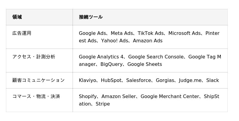 広告7媒体・GA4を含む23のマーケティングツールを単一のMCPエンドポイントで統合。