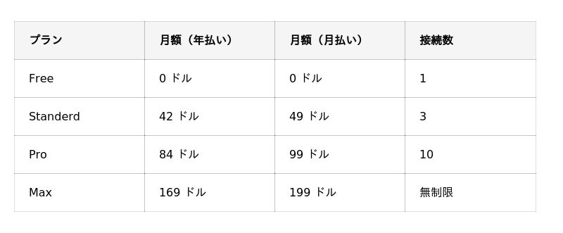 - 14日間無料トライアル(全機能・全接続利用可、クレジットカード不要) - トライアル終了後、1接続で無料継続可能