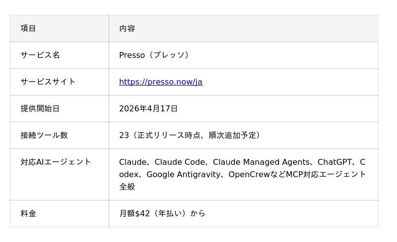 エージェンティックコマースインフラを提供するStellagent株式会社(本社:神奈川県横浜市、代表取締役:鈴木章広、以下「当社」)は、2026年4月17日より、AIエージェント向けマーケティング接続基盤「Presso(プレッソ)」の正式提供を開始いたしました。広告7媒体・GA4を含む23のマーケティングツールを単一のMCPエンドポイントで統合し、Claude・ChatGPTなど任意のAIエージェントからデータ取得・施策実行を可能にします。