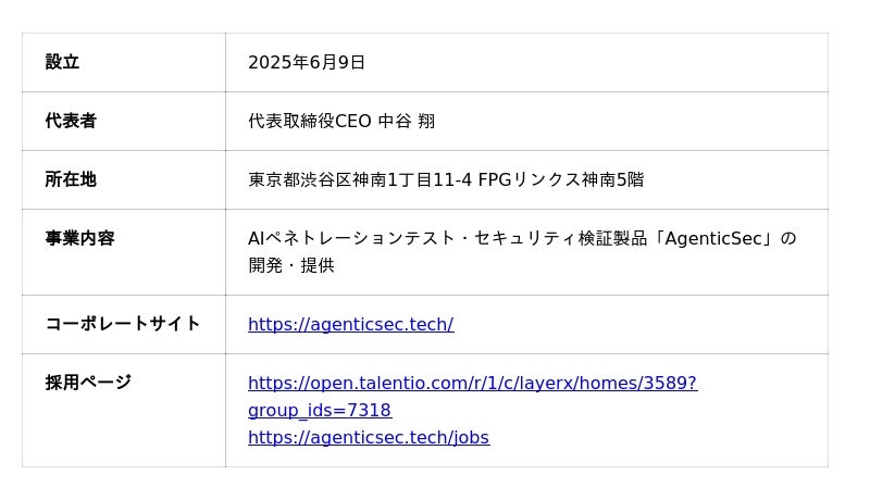 株式会社AgenticSec(本社:東京都渋谷区、代表取締役CEO:中谷翔、以下「AgenticSec」)は、株式会社LayerX(以下「LayerX」)のグループ企業となったことをお知らせします。AgenticSecは、LayerXグループの一員として、AI時代のソフトウェアセキュリティ領域における新たなスタンダードづくりを加速し、あわせて採用を強化します。
