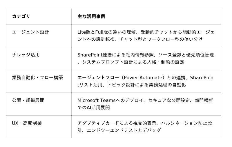 Copilot Studioを通して、エージェント設計・ナレッジ活用・ワークフロー構築・組織展開まで段階的に学びます。