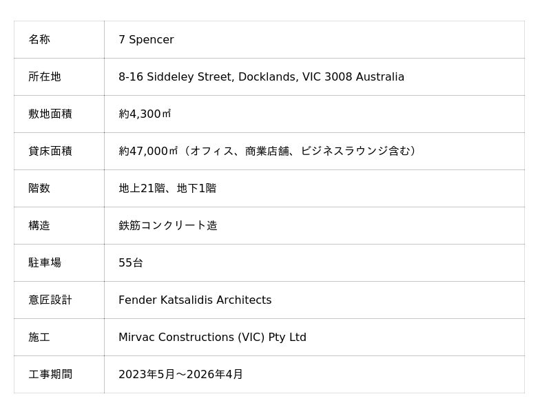 ダイビル株式会社(社長:鍬田博文、本社:大阪市北区)がメルボルン中心地区で豪州大手不動産開発会社Mirvac Limited(マーバック社)[1]と2023年より開発・推進して参りましたAグレードオフィスビル「7 Spencer」が本年4月2日に竣工しましたのでお知らせいたします。