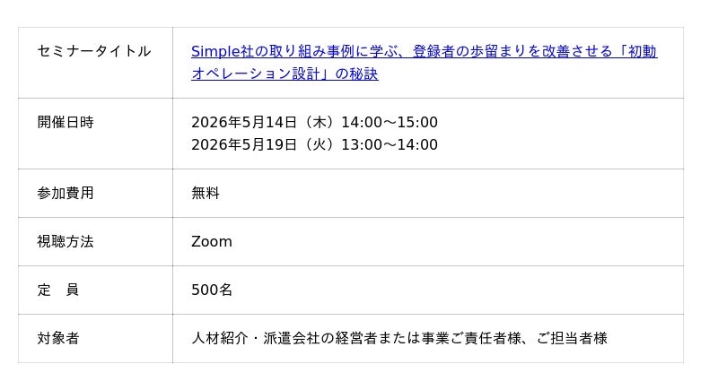 Simple社の取り組み事例に学ぶ、登録者の歩留まりを改善させる初動オペレーション設計の秘訣」の再配信を2026年5月14日(木)、および19日(火)の計2日程にて実施いたします。
