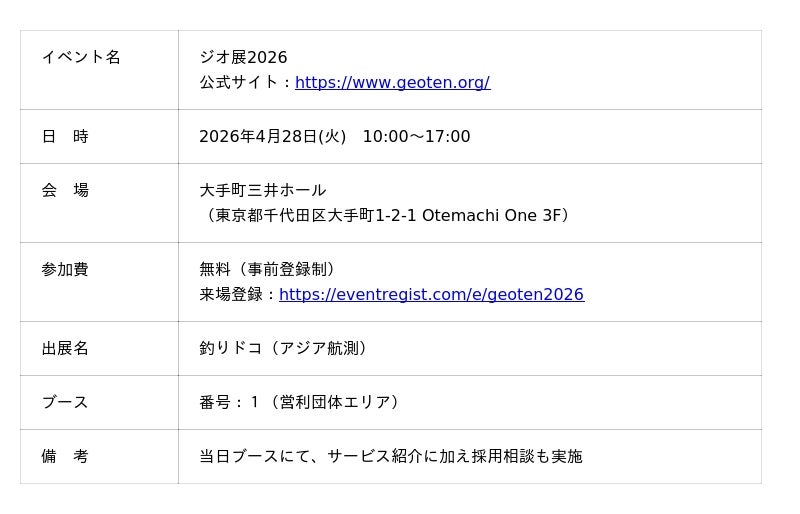 アジア航測株式会社(本社:東京都新宿区、代表取締役社長:畠山 仁)が運営する、釣りWebアプリ「釣りドコ」は、2026年4月28日(火)に大手町三井ホールで開催される「ジオ展2026」に出展します。
