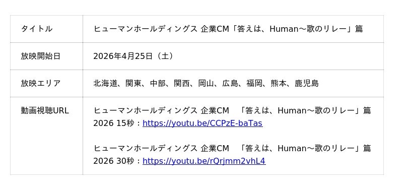 教育を中心に人材・介護・保育・IT・美容・スポーツ事業を傘下に持つヒューマンホールディングス株式会社(本社:東京都新宿区、代表取締役社長:佐藤朋也、以下「当社」)は、2026年4月25日(土)より、テレビCM「答えは、Human~歌のリレー」篇の放送を開始いたします。人手不足や働き方の多様化が進む中、“人の可能性”をどう引き出すかが社会的なテーマとなっています。当社はこの課題に対し、「答えは、Human。」というメッセージのもと、企業CMを通じてその価値を発信しています。本CMは、昨年の放映時に多くの反響をいただいたことから、本年はより多くの方にメッセージをお届けするため、放送エリアをさらに拡大して放映いたします。