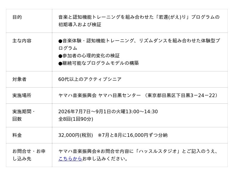 「ハッスルスタジオ」は、音楽体験・認知機能トレーニング・リズムダンス・選食指導を組み合わせて「若還(がえ)り」に挑む世界初*の試みです。これらの要素を統合的に用い、高齢者のウェルビーイング向上を目的とした共同研究および先行体験プログラムは、当会の知見を生かした新たなチャレンジとなります。