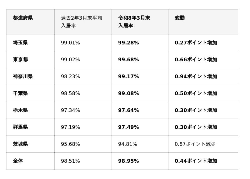 1都3県(東京・埼玉・神奈川・千葉)での入居率が99%を超えたほか、栃木・群馬の北関東2県で過去の平均入居率を上回りました。総務省の「住民基本台帳人口移動報告 2025年」によれば1都3県における転入超過数は12万3,534人に上っており、こうした要因から首都圏における賃貸需要が高まり、当社の高い入居率を後押ししていると考えられます。