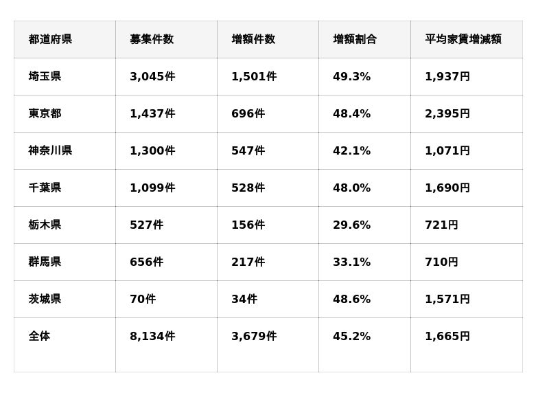 特に1都3県での家賃増額が目立ち、募集物件の約半数で家賃の増額に成功しています。これらの地域は前述の通り入居率が99%を超えている地域と一致しており、旺盛な賃貸需要を背景に家賃の増加が可能な状況となっています。