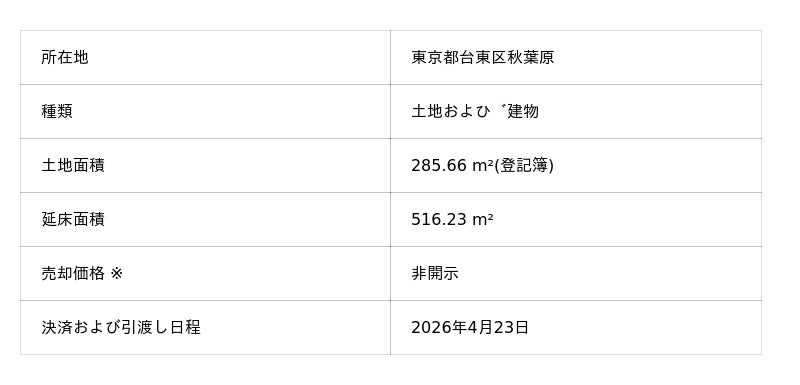 株式会社シーラホールディングス(本社:東京都渋谷区、代表取締役会長:杉本 宏之、証券コード:8887、以下「当社」)は、2026 年2月 13 日付け「販売用不動産の売却に関するお知らせ」にて公表した販売用不動産(以 下、「本件不動産」といいます。)につきまして、本日決済および物件の引渡しを完了しましたので、お知 らせいたします。