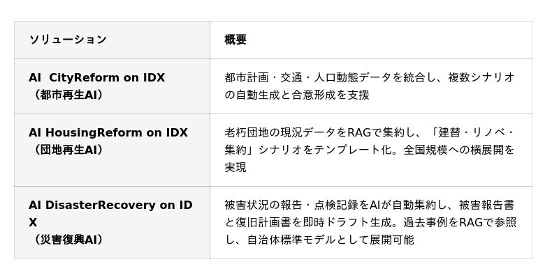 AI CityReform on IDX は、単独での活用にとどまらず、同じAIファクトリー基盤上に構築された2つのソリューションと組み合わせることで、都市・地域が直面する課題を包括的に解決できます。