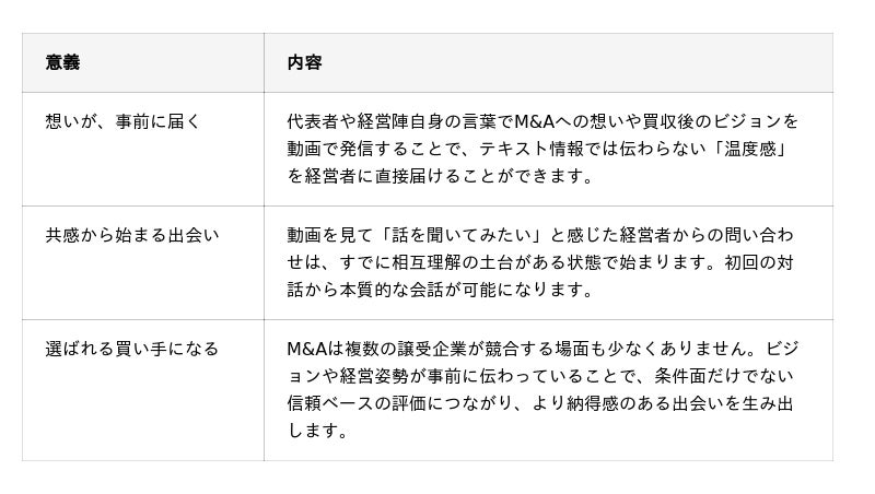 M&Aにおいて、経営者の最終的な判断は条件面だけでは決まりません。「この会社に任せていい」という信頼と共感が、非常に重要です。本サービスでは質の高い動画コンテンツを通じて、譲受企業の信頼を醸成します。
