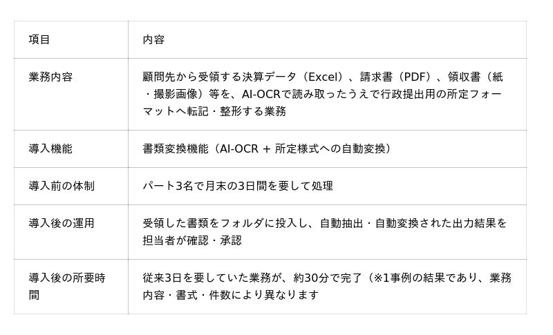 日本全体で生産年齢人口の減少が続くなか、税理士事務所・行政書士事務所・社会保険労務士事務所をはじめとする士業事務所においても、人手不足を採用施策のみで解消することは難しい段階に入りつつあると認識しております。一方で、所内業務の多くは、書類のOCR変換や所定様式への転記など、AIによる支援と親和性の高い定型業務が占めております。