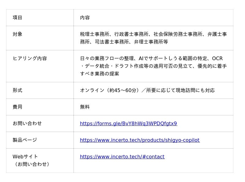 https://www.incerto.tech/)は、税理士・行政書士・社労士・弁護士などの士業事務所向けAIシステム『士業Copilot』の提供を開始いたしました。製品詳細は製品ページ(