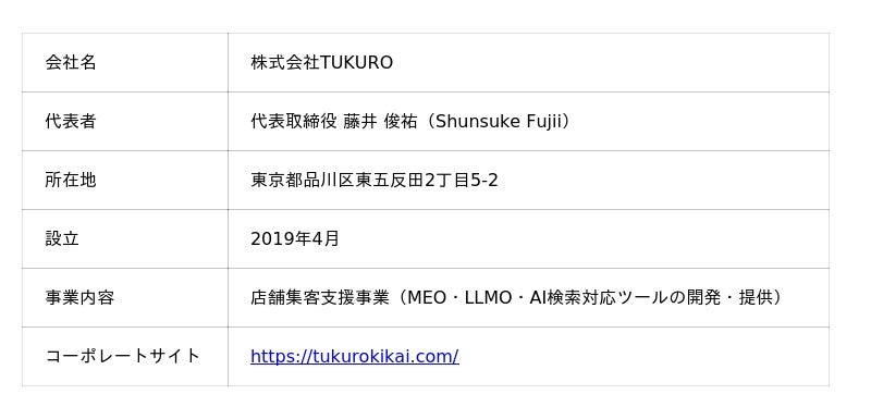 株式会社TUKURO(本社:東京都品川区、代表取締役:藤井俊祐、以下「TUKURO」)は、店舗・地域ビジネスを対象としたMEO・LLMO・AIOに対応した店舗集客支援ツールを正式リリースしたことをお知らせいたします。ChatGPTやGeminiなどのAI検索が普及する現代において、Googleマップ対策(MEO)に加え、AI検索結果への最適化(LLMO)までカバーできる統合型のツールをSaaS形式でご提供します。