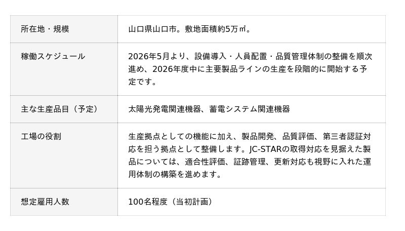 GBPは山口工場において、こうした制度動向を見据え、今後JC-STAR★1の取得が求められる対象機器について、開発・評価・申請準備・生産までを視野に入れた体制整備を2026年度内に進める計画です。発電事業者、EPC、自治体などが今後の制度対応を見据えて製品を検討しやすくなるよう、開発・生産の両面から支える体制づくりを進めます。