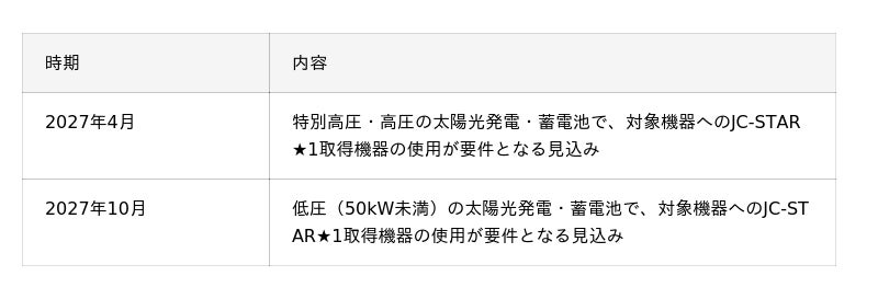 また、資源エネルギー庁は、太陽光発電及び蓄電池について、2027年4月以降に契約申込みを行う特別高圧・高圧案件、2027年10月以降に契約申込みを行う低圧(50kW未満)案件において、通信機能を有する対象機器にJC-STAR★1を取得した機器の使用が系統連系の要件となる方針を案内しています。