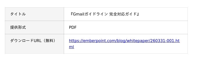 エンバーポイント株式会社(本社:東京都千代田区、代表:五十嵐 真人、以下「エンバーポイント」)は、2026年2月時点の最新情報を反映したホワイトペーパー『Gmailガイドライン 完全対応ガイド』を公開いたしました。本資料は、Gmailが求める送信者要件の「3つの必須要件」を中心に、多くの企業が直面する課題や、継続的な配信品質を維持するための「6つのステップ」を網羅しています。