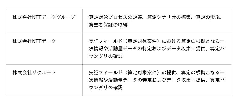 リクルートは、「総排出量配分方式」(注2)を採用していたなか、さらなる高度化に向け、実態に即した算定手法を模索していました。今回、NTTデータグループが提唱する手法を、リクルートの実案件へ適用する共同検証として実施し、精緻な算定手法の有効性を確認しました。