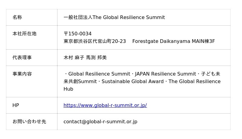 一般社団法人 The Global Resilience Summit は、「Road to 2030:レジリエンスを知のインフラへ」をビジョンに掲げ、日本および世界の行政・企業・学術機関・市民社会と連携しながら、レジリエンスとサステナビリティを両立させる社会OSづくりに取り組むプラットフォームです。
