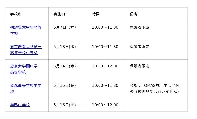株式会社リソー教育グループ(本社:東京都豊島区、代表取締役:天坊真彦)の子会社である、株式会社TOMAS(本社:東京都豊島区、代表取締役:町田仁)は、2026年5月7日(木)より有名中高一貫校を対象とした「学校見学説明会2026」を開催いたします。5月から11月にかけて68校での開催が決定(4月24日現在)。5月は武蔵、青山学院、巣鴨、東京女学館ほか計16校での開催を予定しており、今後も対象校を順次追加してお知らせしてまいります。