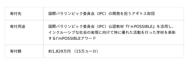 第3弾(2019年): 国際パラリンピック委員会(IPC)が設立した東京2020パラリンピック閉会式で行うI’mPOSSIBLE(アイムポッシブル)アワードを支援