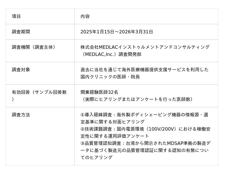 株式会社MEDLACインストゥルメントアンドコンサルティング(本社:福岡県福岡市、代表取締役:小川日出樹)は、海外製ボディシェーピング関連機器の導入実態および運用上の技術的な課題を把握するための独自調査を実施し、その結果を公表いたします。
