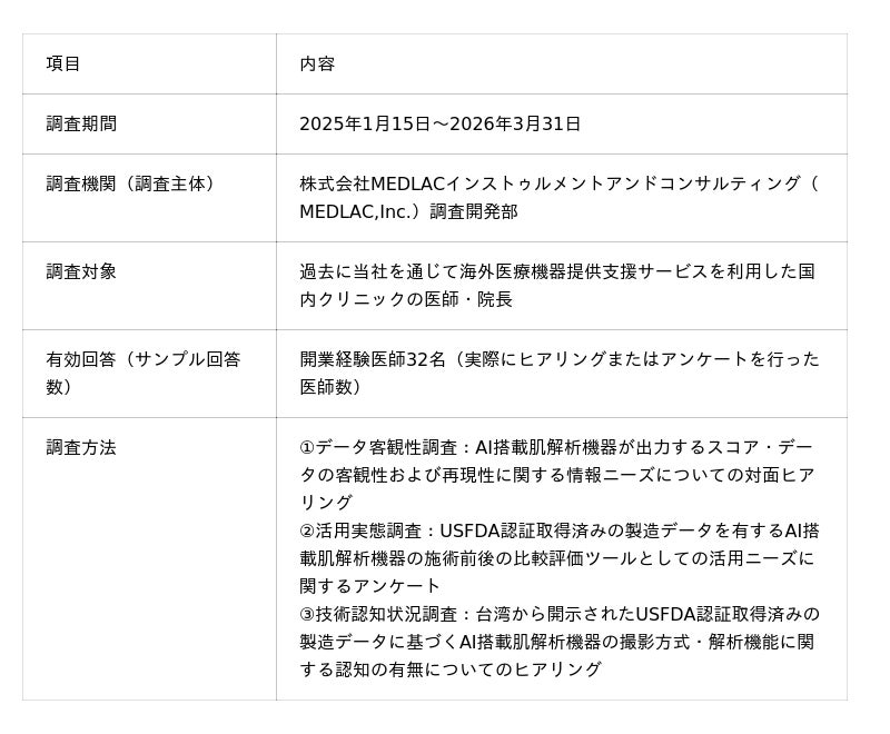 株式会社MEDLACインストゥルメントアンドコンサルティング(本社:福岡県福岡市、代表取締役:小川日出樹)は、海外製AI搭載肌解析機器の情報品質および国内クリニックにおける活用実態に関する独自調査を実施し、その結果を公表いたします。
