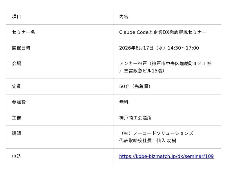 株式会社ノーコードソリューションズ(本社:京都市下京区、代表取締役社長:仙入功樹)は、神戸商工会議所と連携し、2026年6月17日(水)にAIエージェント型ツール「Claude Code」の活用セミナーを開催いたします。