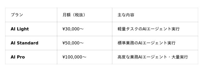 業務領域別にAIエージェントを設計・実装・伴走支援するパッケージを同時リリース。3ヶ月の伴走、総額225万円(税抜)の明朗な価格で、AIエージェント体制をゼロから立ち上げ完了させます。