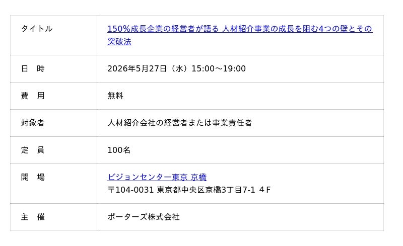 人材ビジネス向けマッチングシステムを提供するポーターズ株式会社(東京都港区、代表 西森 康二)は、2026年5月27日(水)に「150%成長企業の経営者が語る 人材紹介事業の成長を阻む4つの壁とその突破法」を開催いたします。