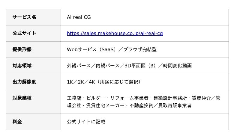 Make House株式会社(本社:東京都港区赤坂、代表取締役:眞木健一)は2026年4月27日、建築特化型画像生成AIサービス「AI real CG」をアップデートしました。内観(インテリア)パース生成機能を新たに搭載し、外観編集機能も追加。