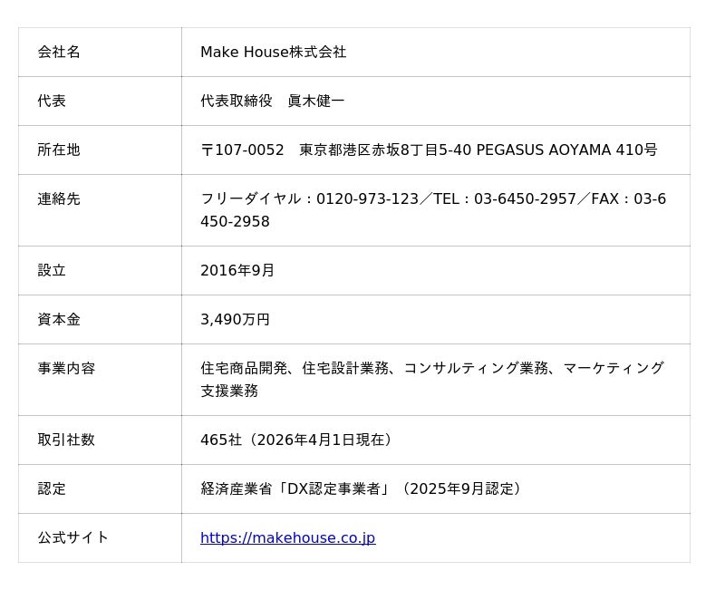 これらの課題は新築・リフォーム・賃貸の各事業者に共通する。Make Houseは住宅業界に特化した本サービスのアップデートを通じ、提案・募集ビジュアル制作のスピード、コスト、品質を一括で改善する。