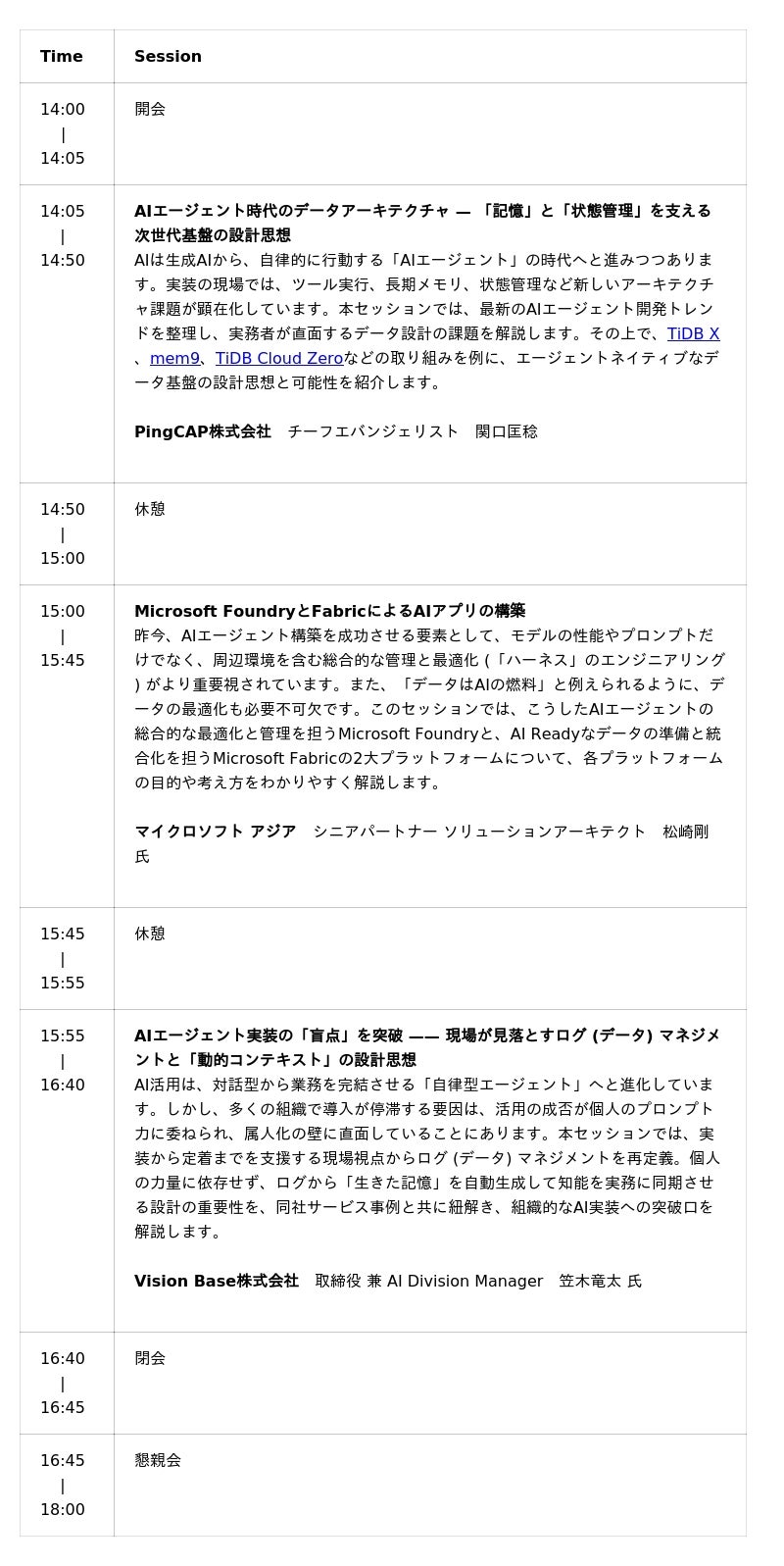 「AIエージェントに最適なTiDBの活用法」「Microsoftが提供するAIの最適解」、そして「Vision Baseによる即戦力の生成AI導入ノウハウ」という、次世代AI活用に不可欠な3つの実践的知見を一挙に習得することができます。TiDBやMicrosoft Foundry + Fabric、となりのAIシリーズが初めてという方も大歓迎です。ぜひ、お気軽にご参加ください。