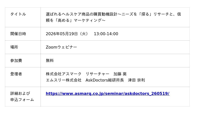 株式会社アスマーク(東京都渋谷区東、代表取締役:町田正一)は、2026年5月19日(火)13:00に、 医療従事者向けプラットフォームを運営するエムスリー株式会社(東京都港区:代表取締役 谷村格)と、「ヘルスケア商品の購買動機設計」をテーマに共催セミナーを開催いたします。